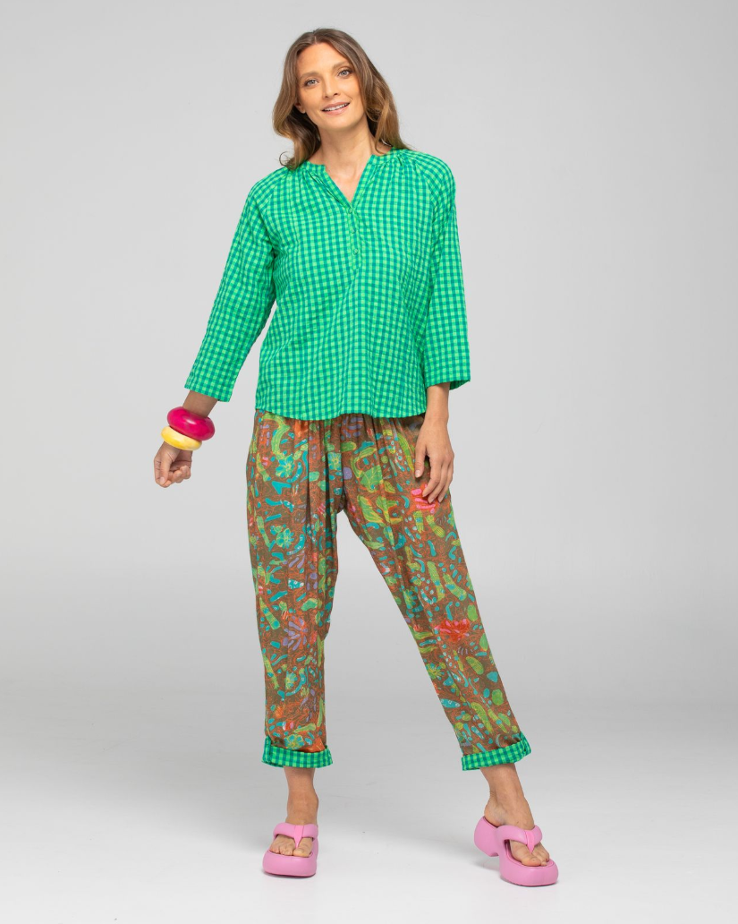 This lovely block top from Boom Shankar is a lovely, free flowing raglan top with a wide sleeve. V-neck with half length button closure. Team with jeans or shorts for a daytime look