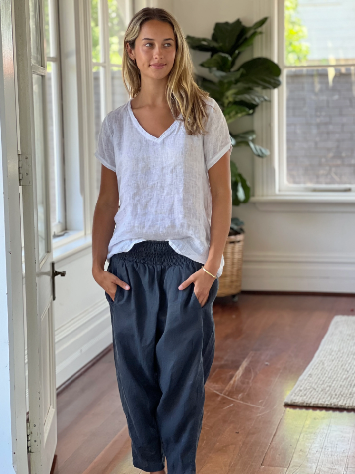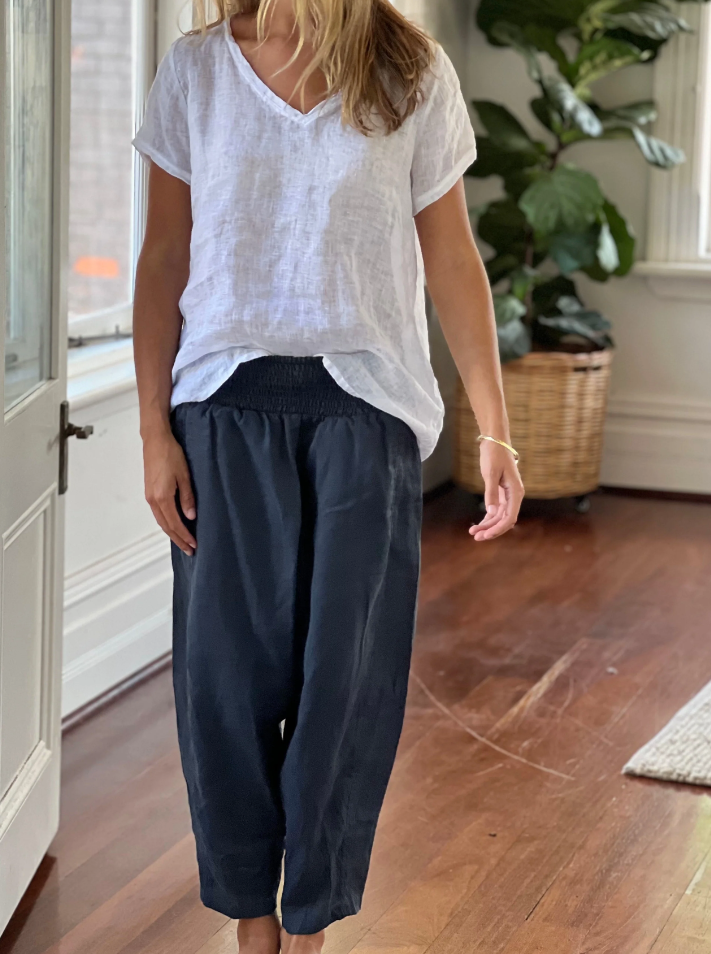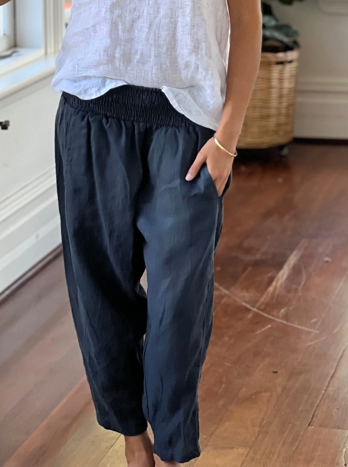These fabulously comfortable linen pants from Frockk have twin inset front pockets and a wide elasticised waist, a super-relaxed fit and a tapered, lantern-style leg. Team with your favourite tee and sandals for a relaxed, summery look. Go to a smaller size if you want less volume.