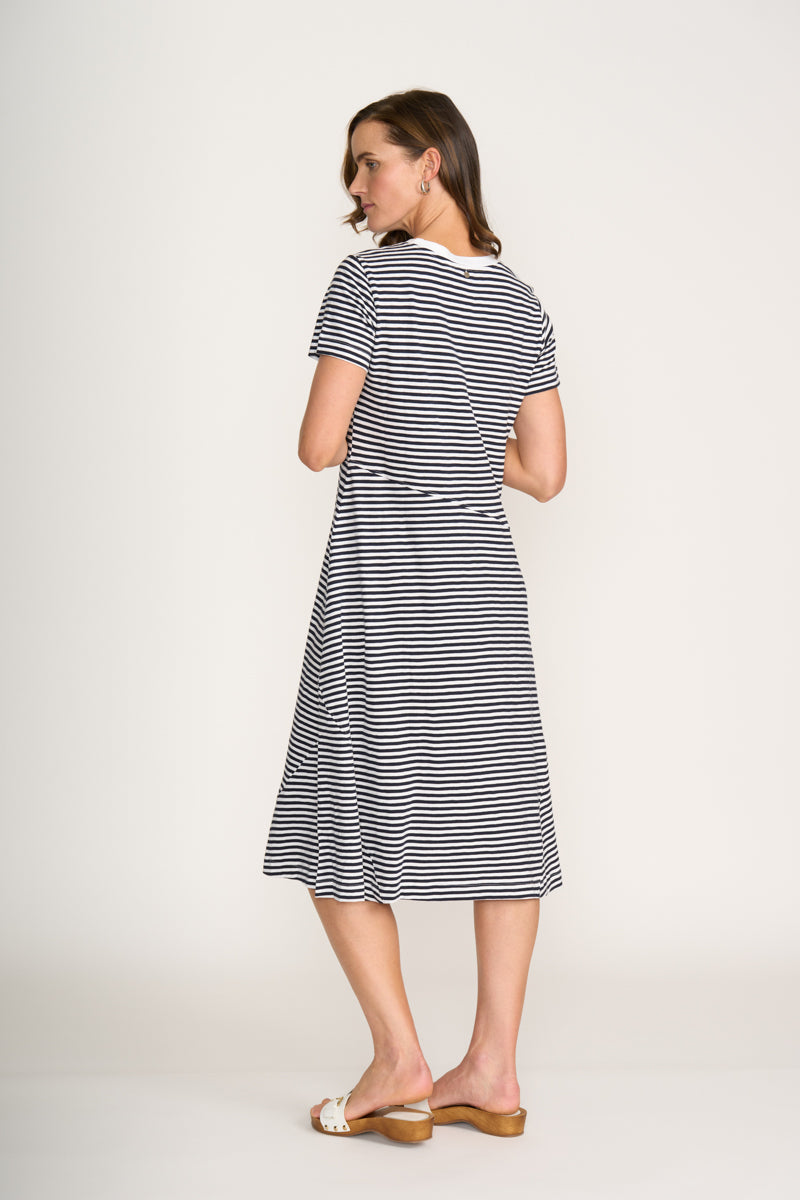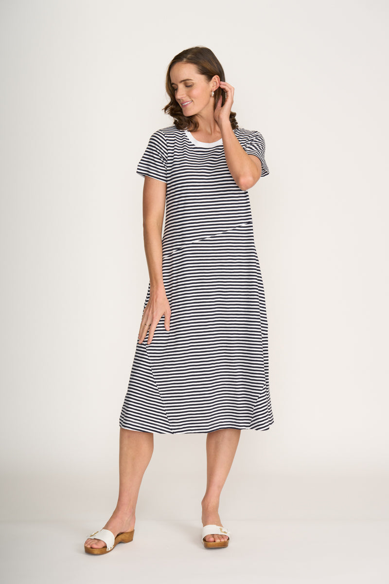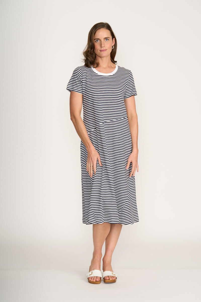 The STITCH TOGETHER DRESS in mini stripe is your go-to for everyday comfort and effortless style. Made from 100% cotton jersey, it offers a soft, breathable feel perfect for all-day wear. Featuring cap sleeves and a contrasting neck trim, this dress delivers understated elegance, while its flattering A-line shape and midi length make it versatile enough for any occasion. Embrace comfort and polish in one easy-to-wear piece.