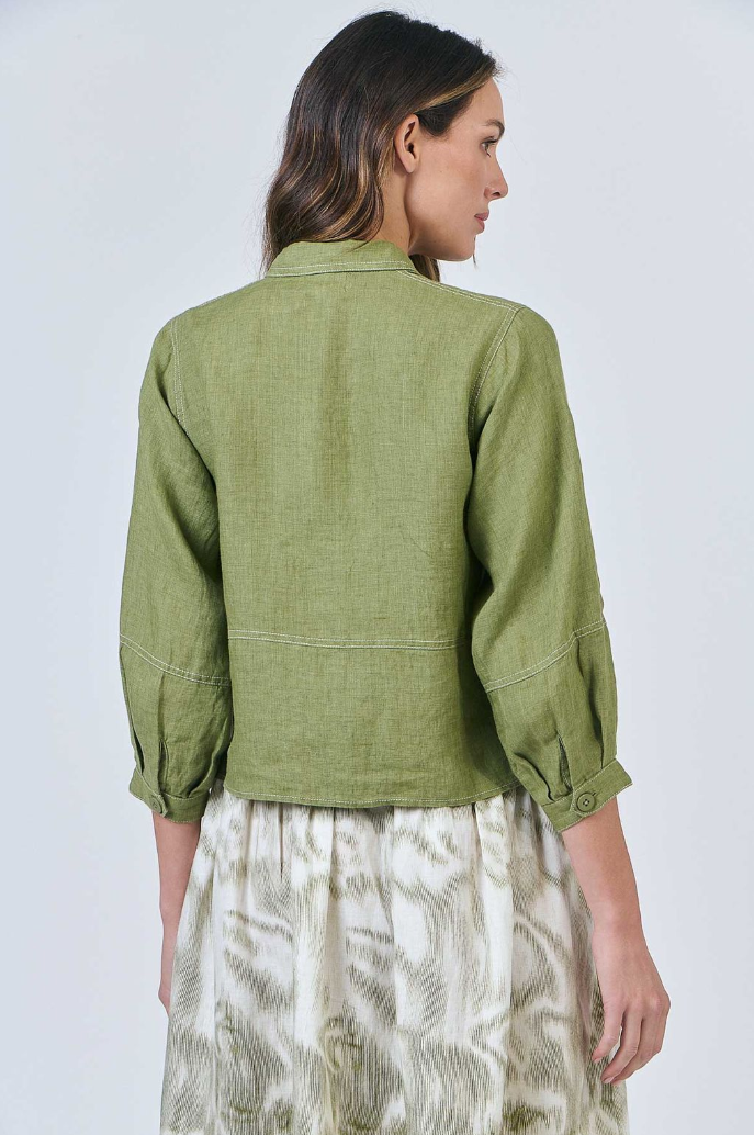 This tailored linen blazer from Naturals by O&J has a minimalistic design.  Twin breast pockets and contrast stitching, along a 3/4 sleeve with pleated cuff detail elevates this gorgeous style.  Elegant lines with a stylish feel.