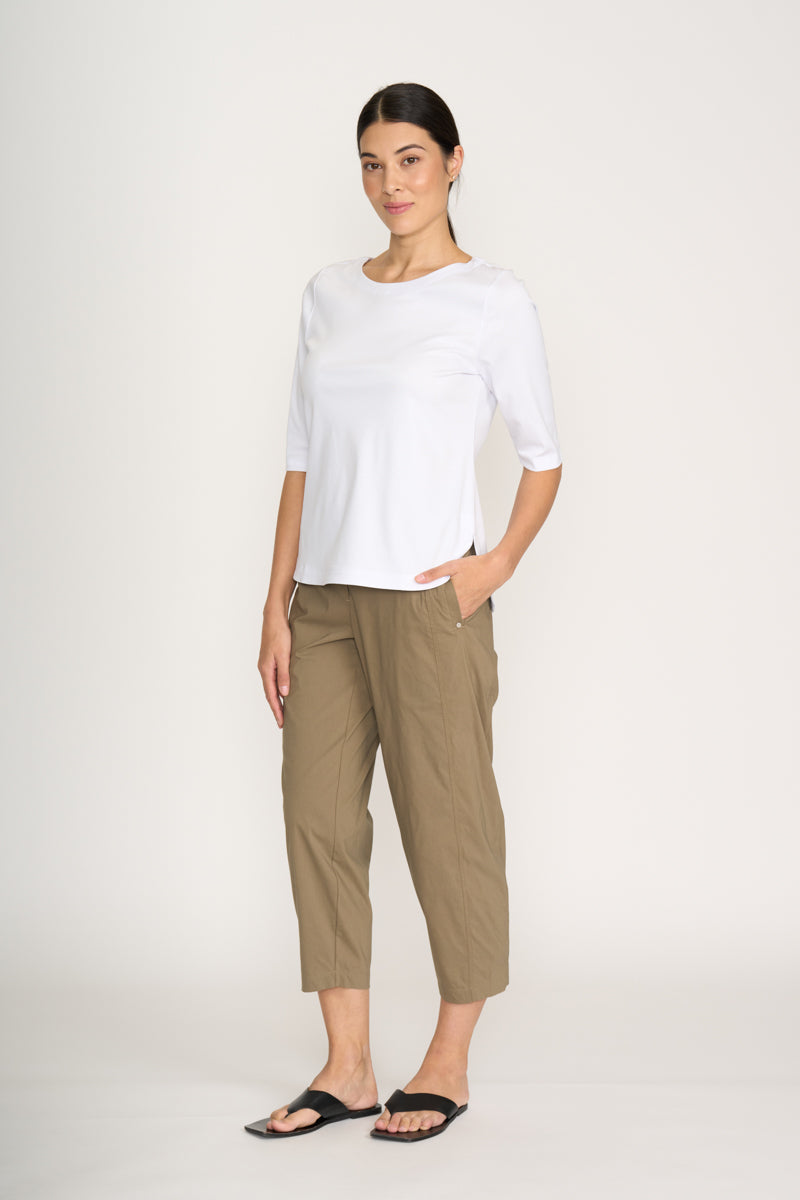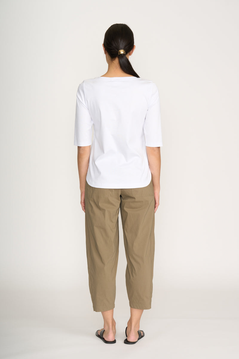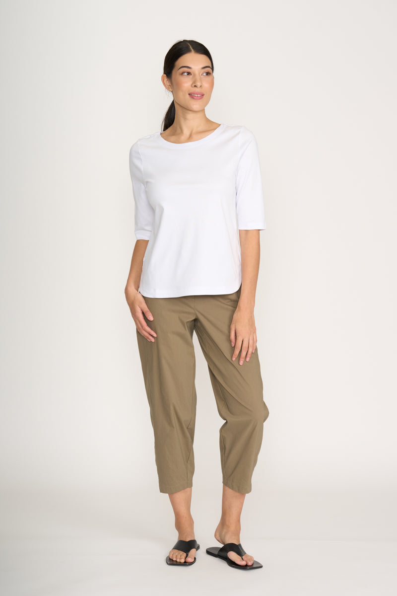 Crafted from 100% mercerised cotton, the Shore Bet Top in white offers a sleek, polished finish that elevates your everyday style. Its comfortable half-length sleeves and flattering boat neck create a refined silhouette, while the curved hem adds a subtle modern touch. Perfect for effortless sophistication, this tee combines breathable fabric with a tailored fit to keep you feeling fresh and confident all day.