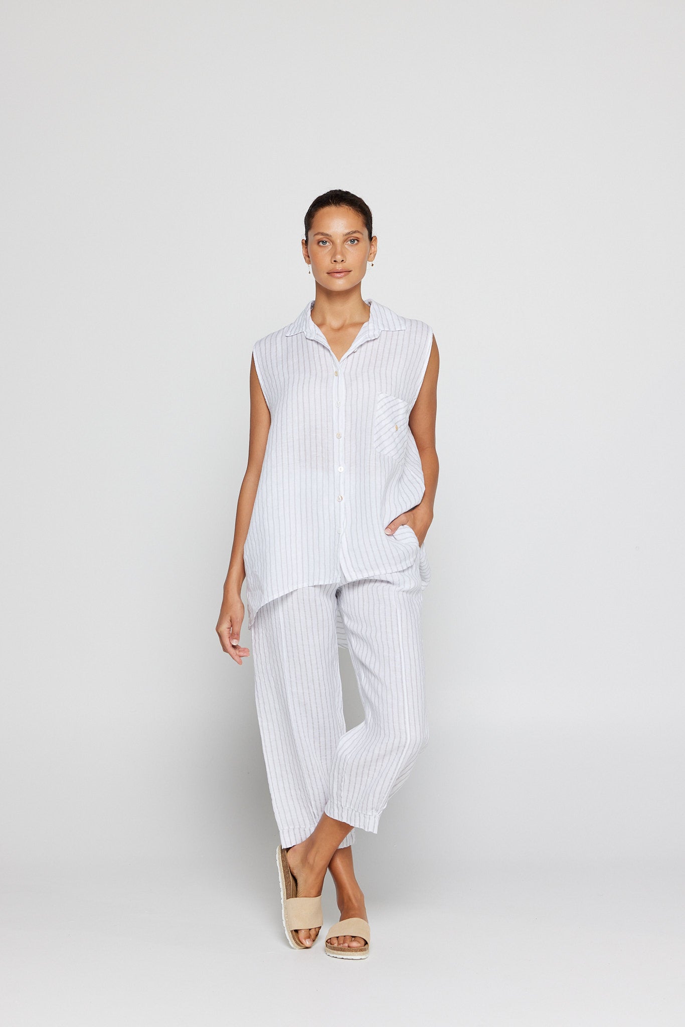 This long-line vertically striped linen shirt from By Ridley features a collar and button-down and a panel in the back with horizontal stripes. It has a wide drop shoulder makes it bra friendly, and the slightly a-line shape means there's room to move. A great classic style that makes dressing for Summer super simple. Just throw on some jeans or shorts sandals, or sneakers and you're ready to go. Layer with a denim jacket or similar on cooler days
